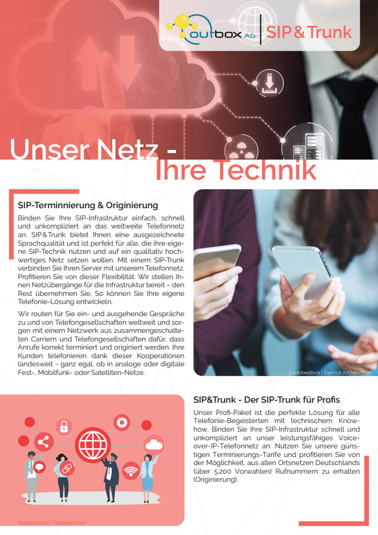 Für Geschäftskunden mit eigener SBC Infrastruktur bietet das Produkt SIP & Trunk die Basis für die Zuführung und Terminierung von SIP-Gesprächsminuten. Gespräche zu Rufnummern werden ohne weiter Umwege direkt auf die vorhandenen Systeme der Kunden geleitet. Durch die hochskalierenden Systeme der outbox AG gibt es kaum Begrenzungen in der Kapazität gleichzeitiger Kanäle.