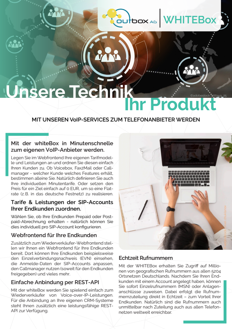 Mit der whiteBox in Minutenschnelle zum eigenen VoIP-Anbieter werden. Legen Sie im Webfrontend Ihre eigenen Tarifmodelle und Leistungen an und ordnen Sie diesen einfach Ihren Kunden zu. Ob Voicebox, Fax2Mail oder Callmanager - welcher Kunde welches Features erhält, bestimmen alleine Sie.